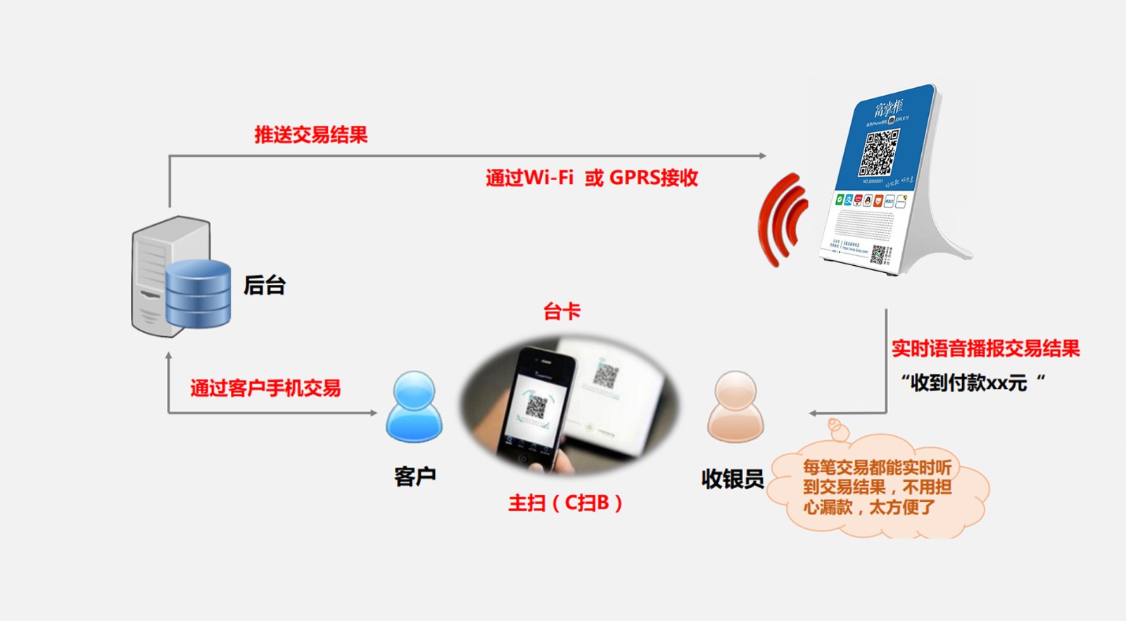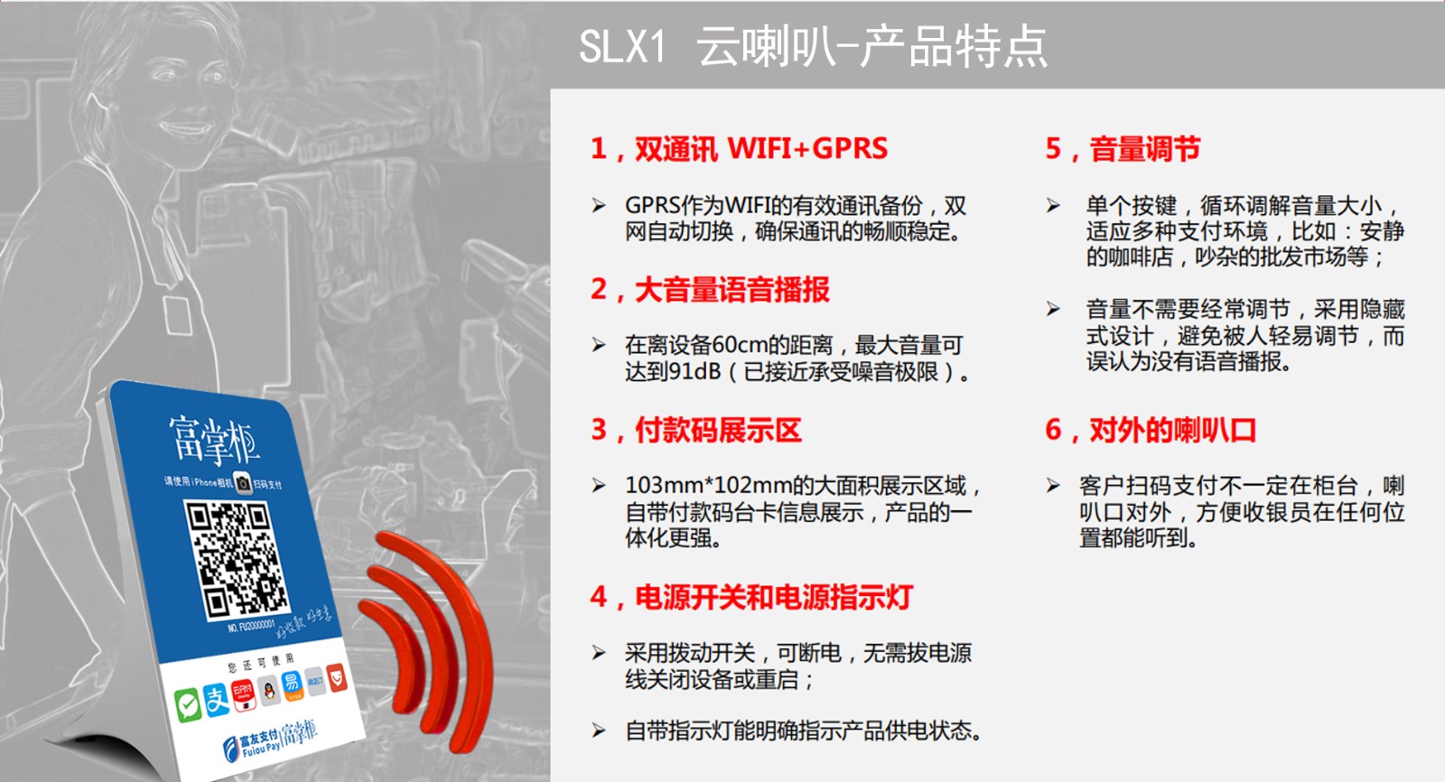 WIFI和GPRS,手機(jī)不在旁邊也能播報,無需店員,掃碼即播。