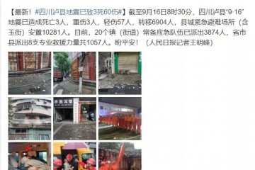 中國地震臺網正式測定:16日4時33分,四川瀘州市瀘縣發生6.0級地震,震源深度10千米截至今日11時,瀘縣“9·16”地震20個鎮(街道)“120”共接報91人,其中:死亡3人,重傷3人,輕傷85人,緊急轉移73755人,緊急…