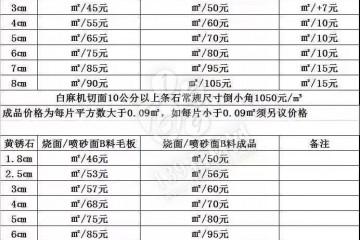某礦山加工為一體的大型石材企業(yè)發(fā)布通知:因礦山開采成本上漲,人工成本上漲,各種工廠加工成本上漲,路沿石價格上調(diào)100元每立方,板材每平方上漲2元。河南泌陽芝麻白2019年3月11日起本礦山方料調(diào)整后每立方單價…