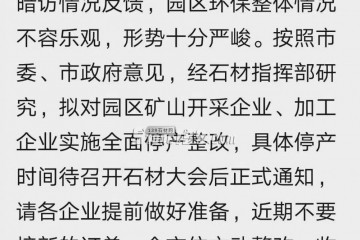 預 通 知各礦山開采企業(yè)、園區(qū)加工企業(yè):根據(jù)環(huán)保督察組兩次到園區(qū)暗訪情況反饋,園區(qū)環(huán)保整體情況不容樂觀,形勢十分嚴峻。按照市委、市政府意見,經(jīng)石材指揮部研究,擬對園區(qū)礦山開采企業(yè)、加工企業(yè)實施全面停…