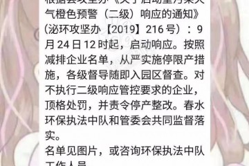 @【通知】春水鎮(zhèn)各石材加工企業(yè):根據(jù)縣攻堅辦《關(guān)于啟動重污染天氣橙色預(yù)警(二級)響應(yīng)的通知》(泌環(huán)攻堅辦【2019】216號):9月24日12時起,啟動響應(yīng)。按照減排企業(yè)名單,從嚴(yán)實施停限產(chǎn)措施,各級督導(dǎo)隨即入…