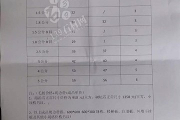 厚度光面毛板(元/平方)火燒面毛板(元/平方)切邊費(fèi)(元/平方)1.5cm33/31.8cm353431.5B料27/31.8B料29/32.5cm433843.0cm464144.0cm555055.0cm65596注:毛板價(jià)格+切邊費(fèi)=成品價(jià)格路沿石料常規(guī)規(guī)格1000元/立方,…
