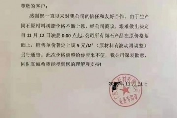 漲價潮來了,五蓮縣板材上漲3-5元,路沿石上漲100元,朋友圈全是漲價的節奏,慌了!由于礦山安全隱患排查整改,遲遲不能開工,石材荒料價格上漲,現板材每平米上浮3~5元,路牙石每立方上浮100元,本公司對已付款…