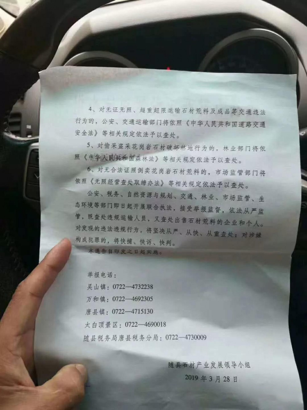 公安、稅務、自然資源與規劃、交通、市場監管、生態環境等部門即日起開展聯合執法,接受舉報監督,依法從嚴監管,既查處違規運輸人員,又查處出售石材荒料的企業和個人。對發現的違法違規行為,將堅決從嚴、從快、從重查處;對涉嫌構成犯罪的,將快捕、快訴、快判。
