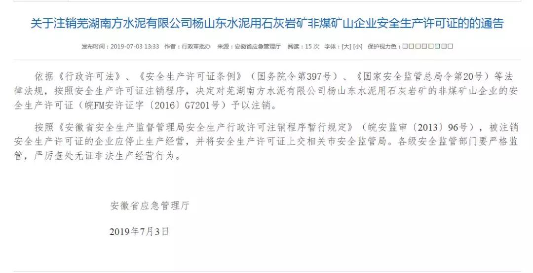 依據《行政許可法》、《安全生產許可證條例》(國務院令第397號)、《國家安全監管總局令第20號)等法律法規,按照安全生產許可證注銷程序,決定對蕪湖南方水泥有限公司楊山東水泥用石灰巖礦的非煤礦山企業的安全生產許可證(皖FM安許證字〔2016〕G7201號)予以注銷。
