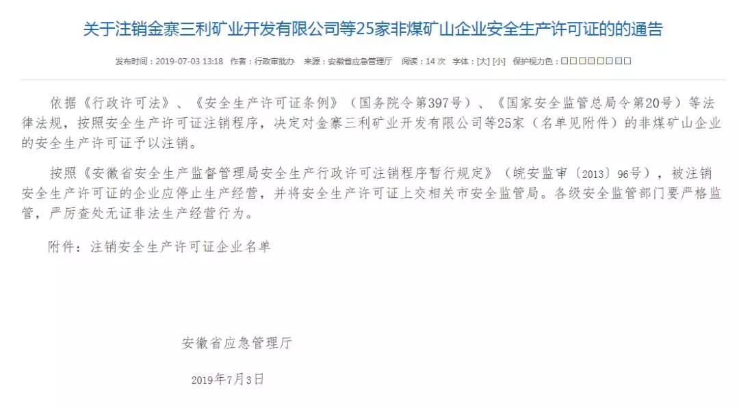 據安徽省應急管理廳官網消息,7月3日,安徽省應急管理廳公布了關于注銷蕪湖南方水泥有限公司楊山東水泥用石灰巖礦非煤礦山企業安全生產許可證的的通告,同時,還發布關于注銷金寨三利礦業開發有限公司等25家非煤礦山企業安全生產許可證的的通告。
