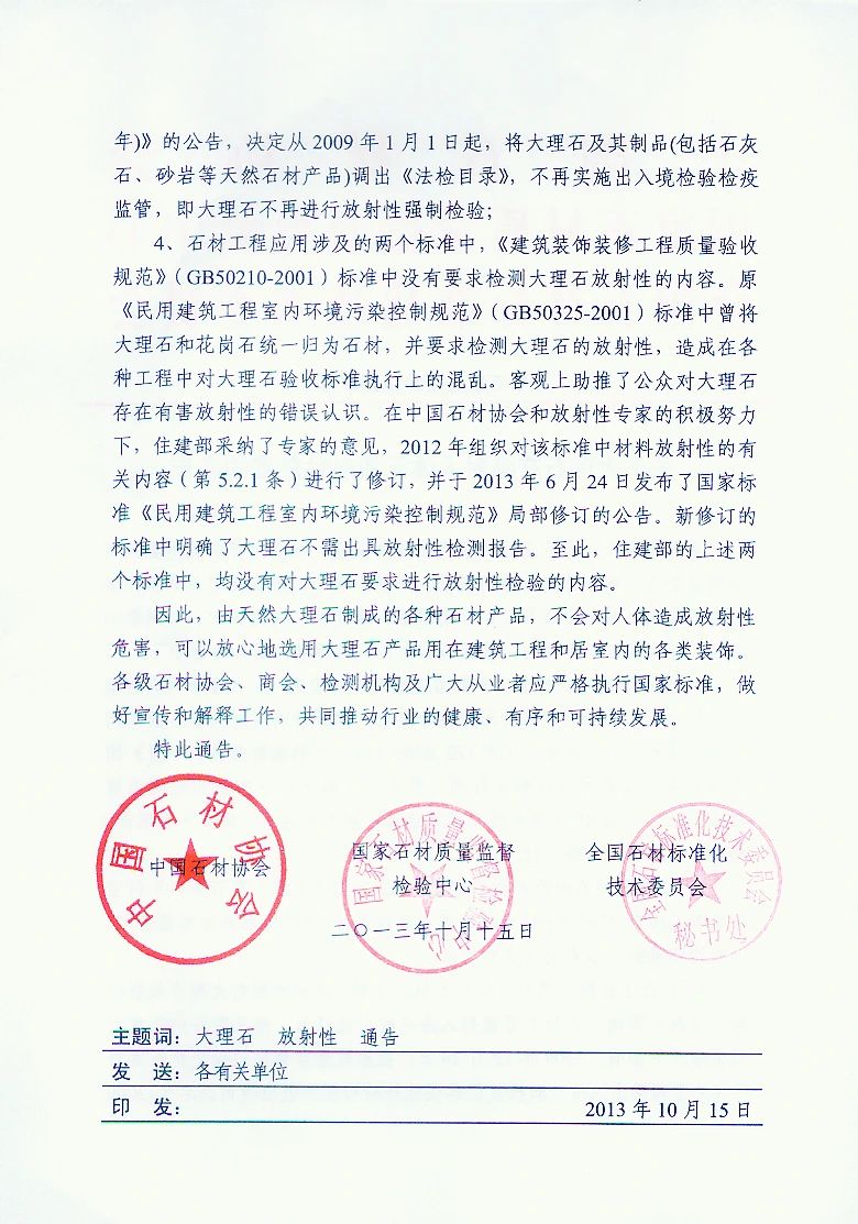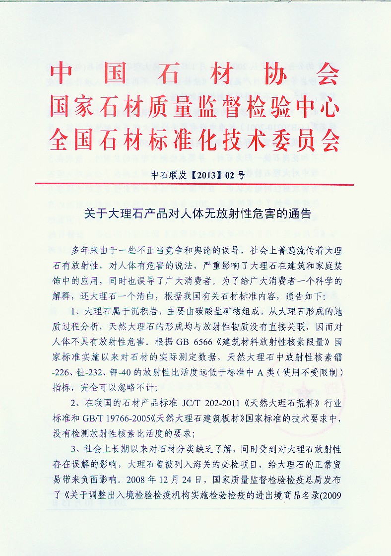 南方日報在2013年也曾報道介紹,國家石材質量監督檢驗中心近10年來對市場上常用的100余種國產及進口大理石樣品進行的放射性檢驗結果顯示,所有被檢大理石樣品放射性核素比活度平均為002,僅為國家標準《建筑材料放射性核素限量》中A類指標(產銷與使用范圍不受限制)的五十分之一,完全可以忽略不計。