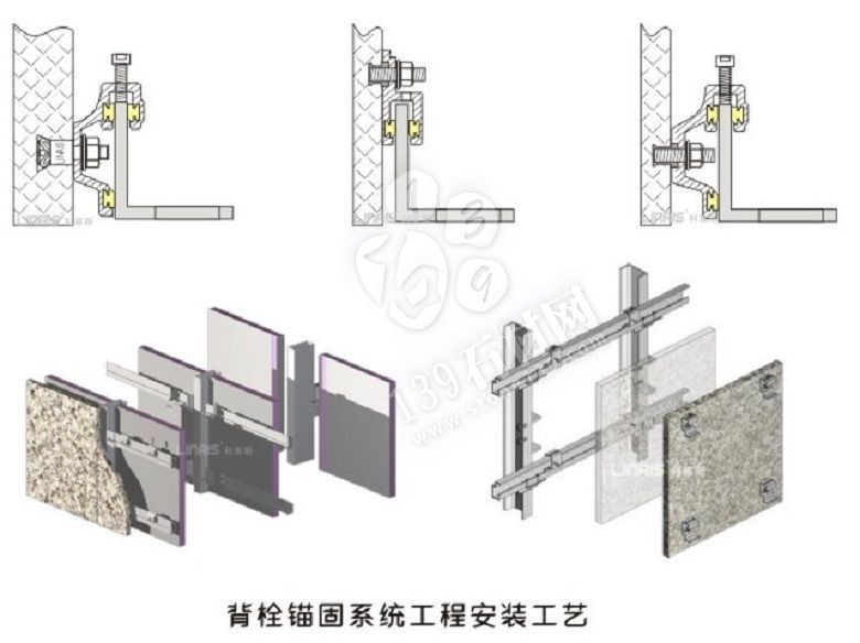 石材作為裝飾工程占比相對較大的主材,其安裝質量的好壞直接影響著裝飾工程的最終效果。常規的石材安裝工藝分為濕貼、干掛以及濕掛,干粘、干掛石材根據固定方式的不同常見的有開槽式和背栓式