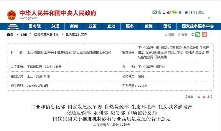 近期,工業和信息化部、國家發展改革委、自然資源部、生態環境部等十部門聯合發布《關于推進機制砂石行業高質量發展的若干意見》。