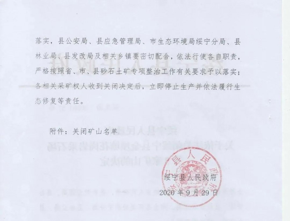 9月30日,湖南省邵陽市綏寧縣人民政府發布了關于:《綏寧縣人民政府關于依法關閉綏寧縣金屋塘花崗巖采石場等3家礦山的決定》
