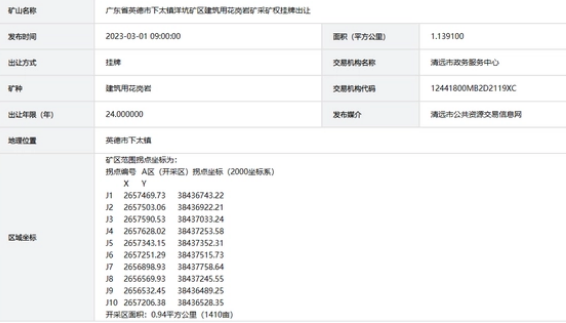 該礦權位于英德市下太鎮,生產規模為400萬立方米/年,出讓年限24年(含基建期 ),掛牌出讓起始價為人民幣10.5億元。