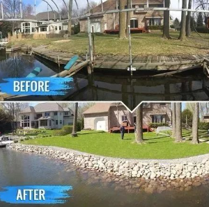 砌石護岸的做法,先挖地基,再打地釘樁,其上再修砌石堤。