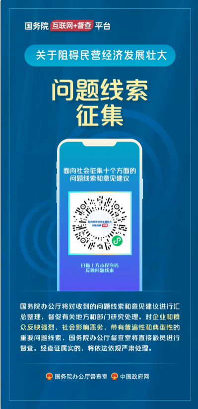 《中共中央 國務院關于促進民營經濟發展壯大的意見》的重磅文件發布后,一系列配套措施開始部署。7月28日晚間,國務院辦公廳發布關于征集阻礙民營經濟發展壯大問題線索的公告。為推動解決民營經濟發展壯大面臨的困難和問題,根據有關工作部署,國務院“互聯網+督查”平臺從即日起面向社會征集十個方面的問題線索和意見建議。