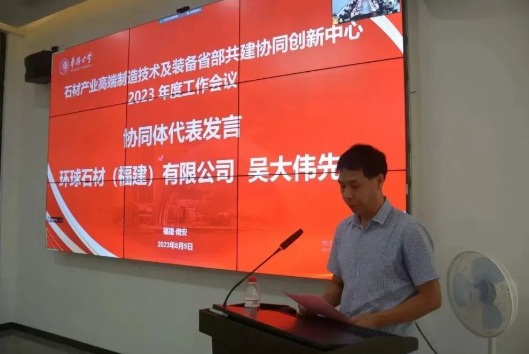 環球石材(福建)有限公司生產總經理吳大偉先生作為協同體單位代表發言。他表示成為中心協同體的一員,這不僅是對中心與環球石材過去合作成果的充分肯定,也是對環球石材未來發展的支持與鼓勵,希望中心和環球石材在人才輸送、科技成果轉化等方面開展深度的交流合作。