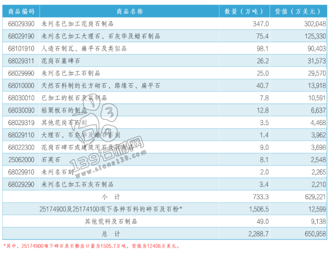 對中國臺灣的出口中含25174900項下碎石及石粉602.7萬噸,貨值5903萬美元。