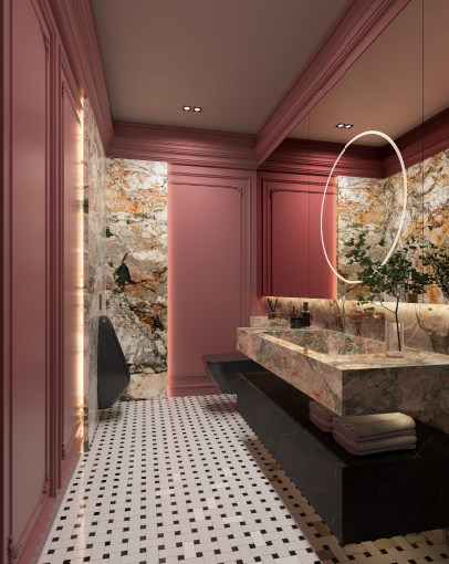 衛生間的墻面和地面鋪設四季粉大理石,能夠帶來一種獨特的視覺沖擊。粉色的紋理在水汽的氤氳中若隱若現,仿佛將您帶入了一個浪漫的水療世界,讓您在忙碌的一天后,能夠盡情放松身心,享受片刻的寧靜與愜意。