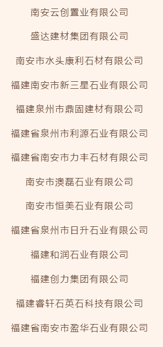 福建省東升石業股份有限公司福建省華輝石業股份有限公司福建鵬翔實業有限公司泉州英良石材有限公司福建省新鵬飛實業發展有限公司福建省南安市弘一石業有限公司福建省南安市遠達石材有限公司福建省南安市閩南建材第一市場有限公司泉州市澳盛石材市場有限公司環球石材(福建)有限公司福建省東星建設集團有限公司泉州市新興石材工藝有限公司福建南安市南輝大理石有限公司棋盛石材有限公司中國民生銀行股份有限公司泉州水頭支行泉州耀升石業有限公司福建溪石股份有限公司南安云創置業有限公司盛達建材集團有限公司南安市水頭康利石材有限公司福建南安市新三星石業有限公司福建泉州市鼎固建材有限公司福建省泉州市利源石業有限公司福建省南安市力豐石材有限公司南安市澳磊石業有限公司南安市恒美石業有限公司福建省泉州市日升石業有限公司福建和潤石業有限公司福建創力集團有限公司福建睿軒石英石科技有限公司福建省南安市盈華石業有限公司2024年度上市企業及榮獲國家級重點“小巨人”稱號等企業名單南安市石材協會新增省級“專精特新”中小企業泉州市大鯊魚機械科技有限公司南安市奧力石業有限公司福建巨邦機械有限公司福建泉州南星大理石有限公司福建省南安市弘一石業有限公司福建睿軒石英石科技有限公司