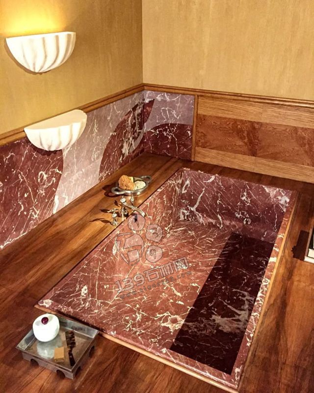 在潮濕環境中,紫羅紅大理石的耐候性需優先考量(建議選人工染色板或優質天然石)。可將其用于浴室臺面或局部墻面,搭配啞光黑金屬支架或深色瓷磚,形成高級感對比。例如,懸浮式臺盆搭配紫羅紅大理石臺面,背景墻以幾何拼花點綴,瞬間打破傳統衛浴的沉悶。