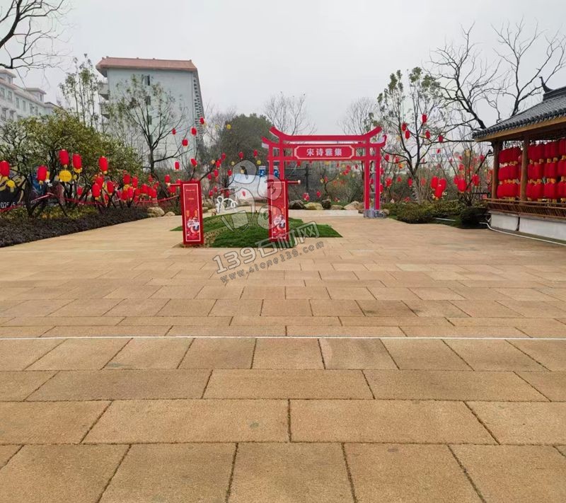 一、地鋪工程:千年古鎮(zhèn)步行街 項目背景: 浙江某明清風格古鎮(zhèn)改造,需兼具防滑性、古樸質感及文化符號的地鋪石材。 設計亮點: 材料選擇:遂昌紅花崗巖火燒面(厚度30mm),表面粗糙防滑,雨天不打滑。 拼花工藝:主街采用600×900mm大板錯縫鋪貼,縫隙嵌入青石條仿“古道車轍痕”。 文化融合:在十字路口鑲嵌銅雕蓮花(石材鏤空嵌銅),呼應古鎮(zhèn)佛教歷史。 施工難點: 弧形巷道切割:通過水刀切割弧形板,最小弧度半徑達1.5米,確保無碎拼雜亂感。 成果:獲“浙江省歷史街區(qū)保護示范工程”稱號,石材五年無開裂、褪色。