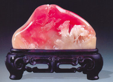 、巴林石:是富含硅、鋁元素的流紋巖,受到火山熱液蝕變作用而發(fā)生高嶺石化形成的。巴林石在成礦晚期,一些硫化物和其他礦物質(zhì)沿高嶺石的裂隙貫穿,或斑布、浸染,因而擴(kuò)大了高嶺石的品種數(shù)量。另外,除了硅和鋁,鈣、鎂、硫、鉀、鈉、錳、鐵、鈦等元素的存在和比例上的變化,也造就了巴林石豐富的色彩。優(yōu)質(zhì)石就是所稱的雞血石。