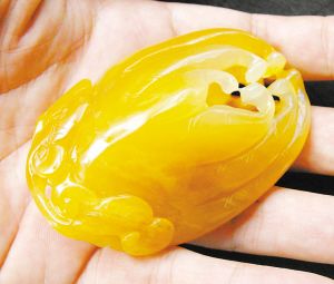 4、黃蠟石:又名龍王玉,因石表層內蠟狀質感色感而得名。屬矽化安山巖或砂巖,主要成份為石英,油狀蠟質的表層為低溫熔物,韌性強,硬度 6.5~7.5。 “豬肉石”是地質運動過程中沉積巖或變質巖與其他礦物質接觸色化而成,多產于廣西柳州市。因其長有“皮肉”、“肥肉”和“瘦肉”多層次,顏色酷似豬肉,稱為“豬肉石”。收藏者多把“豬肉石”看做吉祥、喜慶的象征。黃蠟石質感源于石英,而其顏色則來自氧化的鐵質。