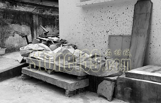 石碑用帆布覆蓋著放在醫院配電房旁邊