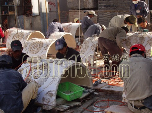 整體圖案粘拼后,畢竟不可能真正實現無縫連接,或多或少會存在縫隙,而且也有可能有加工是上的小瑕疵,所以需要對石材拼花進行修補和添縫。通常做法是用環氧樹脂、石粉和色料均勻拌合并調成所要修補添縫的石材的顏色,等調到顏色和石材相似時,加入小量催干劑混和,并迅速修補填充到縫隙處,一定和填充到位讓粘合劑滲入到位,等粘合劑干了就可以刮掉表面色料。最后在整個石材拼花的背面鋪上纖維紗網,撒上石粉淋樹脂,均勻抹平,使紗網與石板粘合,以加固拼花板面。