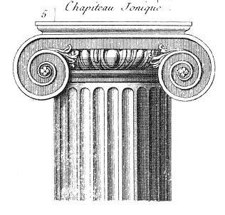 柱式與古希臘愛奧尼克柱式相同,只是把柱頭上兩個渦卷間的連接曲線改為水平直線。