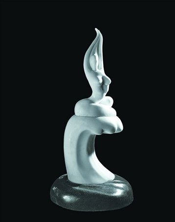 該作品為漢白玉雕刻品,底部為抽象水浪,上部為葉片狀的人體,暗喻在水分的滋潤下,大地母親催生綠葉萌芽,萬物舞動預(yù)示著春天來臨,給人以積極向上的觀感。