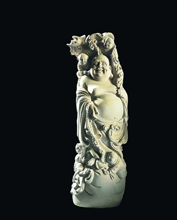 采用黃沙巖石材雕刻而成。佛與凡童同樂同歡,皆大歡喜,手拿人參(閩南語中,“參”的讀者同“心”),體現(xiàn)世世皆快樂、世界一家親的理念。
