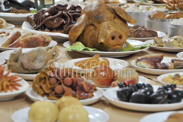 紅燒豬頭肉、小籠包子、清蒸甲魚、高粱饅頭,紅燒蹄髈……這100多道栩栩如生的菜,全部用金華黃蠟石而成,這套名為“滿漢全席”的玉石組雕栩栩如生,是張述春夫婦收藏了2000多萬元玉石,精選雕琢而成的.