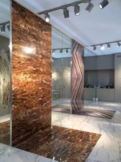 展位設(shè)計(jì)啟用的意大利團(tuán)隊(duì),由法國(guó)羅浮宮博物館修繕設(shè)計(jì)大師盧卡•羅西(Gianluca Rossi)率領(lǐng),這位被譽(yù)為“空間藝術(shù)的先鋒騎士”采用大理石的表現(xiàn)手法呈現(xiàn)簡(jiǎn)一大理石瓷磚的逼真效果。