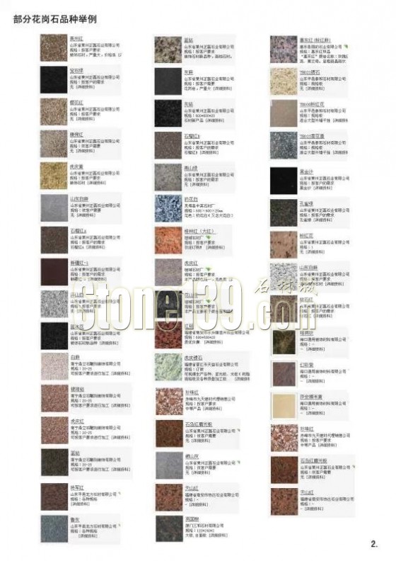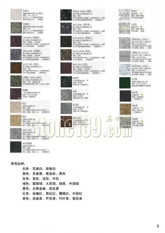 芝麻黑 蝦紅 銹石 青石 塞北金麻 中國黑 山西黑 蒙古黑 墨玉黑 豐鎮黑 珍珠白 石島紅 菊花黃 楓葉紅 承德綠 芝麻白 福鼎黑 江西綠 安溪紅 丁香紫 九龍壁 珍珠花櫻花紅 山東白麻 羅源紅 天山紅 金彩麻 雪花青 翡翠綠 珍珠紅 大白花 將軍紅 岑溪紅 石榴紅 燕山紅 巴厝白 內厝白福建白麻 三堡紅 桂林紅 柏坡黃 永定紅 同安白 桃花紅 金鉆麻 豹皮花 齊魯紅 海浪花 森林綠 黑白花 紫羅蘭 泉州白 漳浦紅漳浦青 嶗山灰 平度白 文登白 粉紅花 牡丹紅 吉林白 濟南青 嶗山紅 惠東紅 中國綠 西麗紅 蝴蝶綠 漳浦黑 浪花白 五蓮紅 冰花蘭魯灰 壽寧紅 中國紅 天山藍寶 粉紅麻 河北黑 萬年青 蝴蝶藍 黃金麻 虎皮白 夜玫瑰 虎皮紅 墨玉 蝦紅 三寶紅 孔雀綠 新疆紅中國棕 翡翠綠 芝麻灰 藍鉆 霸王花 銹石 燕山綠 金鉆 揭陽紅 水晶綠 水晶石 藍寶 菊花綠 古典灰麻 高粱紅 中磊紅 黑珍珠粉石英 綠石英 粉砂巖 海洋綠 石榴紅 晶白玉 天寶紅 木紋綠 幻彩麻 冰花綠 天青石 綠鉆 雪里梅 代代紅 濟南青紫點綠鉆