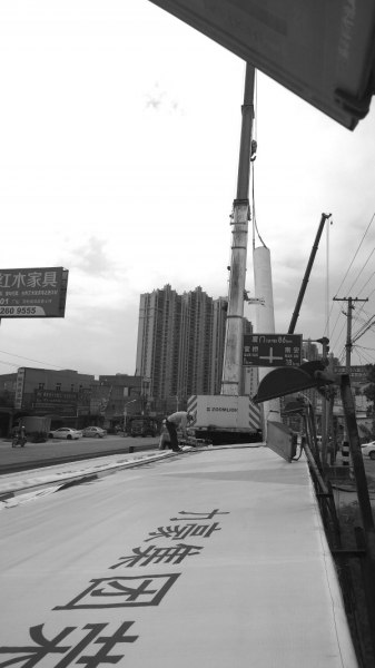 23日上午,在國道324線與南官公路交接處的紅綠燈附近,一臺大型吊機正吊著一個20多米高的T字形廣告牌,在廣告牌和大型立柱接縫處,隨著一陣火星閃現,近百平方米的廣告牌被應聲切下。
