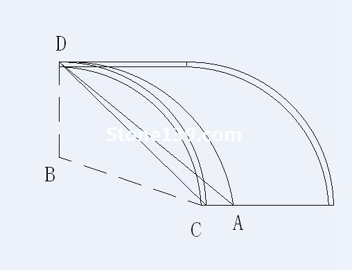 圖中DB、BC為弦長;CD為弧板弦長,AD為斜切后弦長,CA為弧板順高度切除的最大尺寸。可見:<CDA就是以弧板底面定位時的工作臺轉角α,<FCE為扳刀角β: