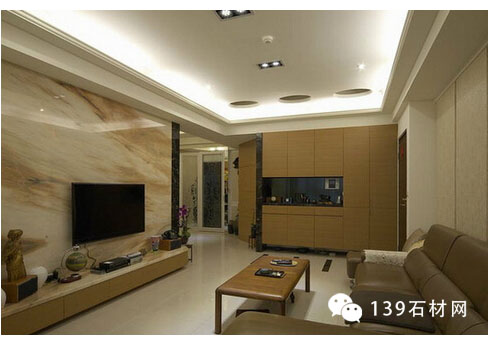 紋理豐澤的巴洛克大理石,從壁面延伸到電視柜平面,一體成形的設計,在周圍間接光源的襯飾下,更見大戶人家風范。