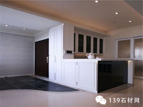 鏡面材質的應用,在客廳電視主墻面上導以菱形收邊,框定住了石材電視主墻層次放大、推演,豐富視覺效果。