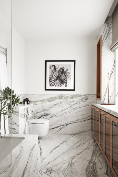 豐富紋理的大理石浴室可以分割空間本身就是一種設計手段,木柜溫暖了整個冰冷的空間。墻上的斑馬賦予空間一種野生的感覺,明亮的自然光沉寂在整體氛圍。