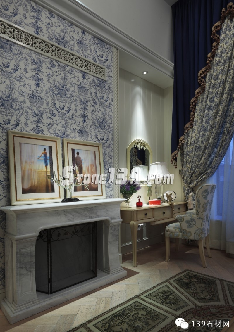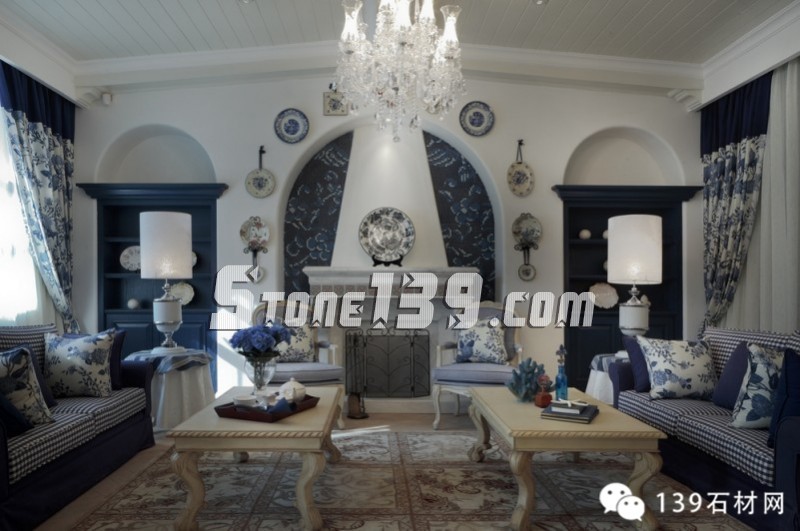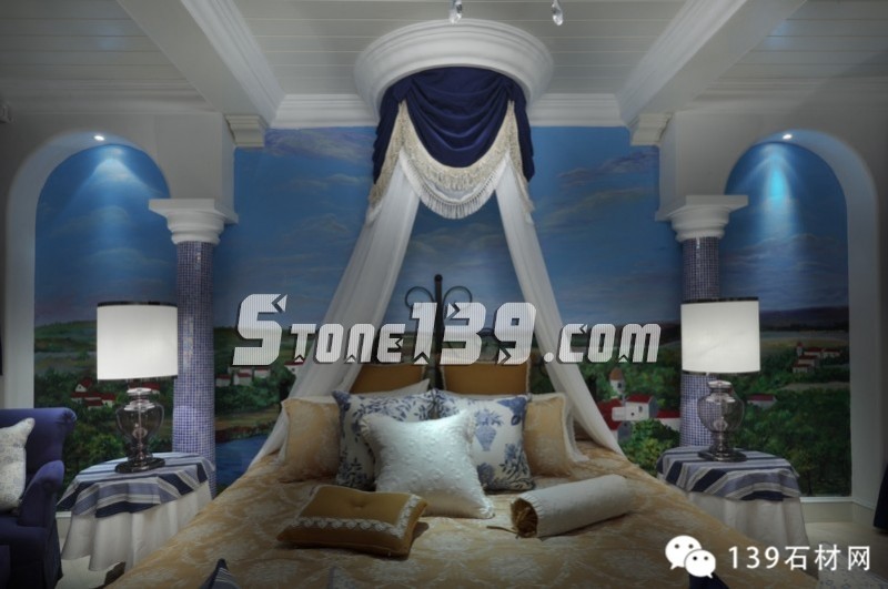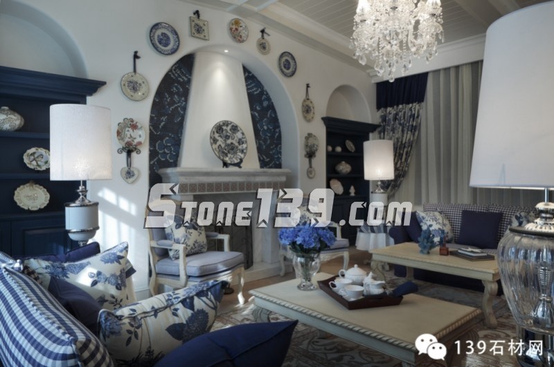 藍(lán)白條紋、古典碎花、花朵馬賽克以及各種藍(lán)與白的花樣圖案以不同的搭配方式重現(xiàn)在這四層空間的各個(gè)角落,仿如瞬間墜入天與海的懷抱。加上時(shí)時(shí)出現(xiàn)的格拉斯風(fēng)景壁畫,那藍(lán)天、白云、綠野和小屋,將人帶入十七世紀(jì)的格拉斯。