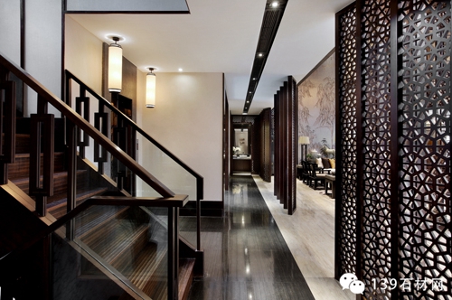 室內處處都陳設著設計師精心設計的陳設品,如家具、燈飾和掛件,也陳列著種類繁多的中國物件,舊家具、陶瓷、線裝書、檀木四合院工藝擺件、佛像、茶具、文房四寶、畫軸,這些古老的物件與現代的設計在恰當的空間里邂逅,讓現代設計蘊涵著深深的歷史印跡,讓古老的中國藝術煥發活力。設計師對中國元素準確的拿捏、運用和組合,讓人切實地感受到東方的人文古韻。