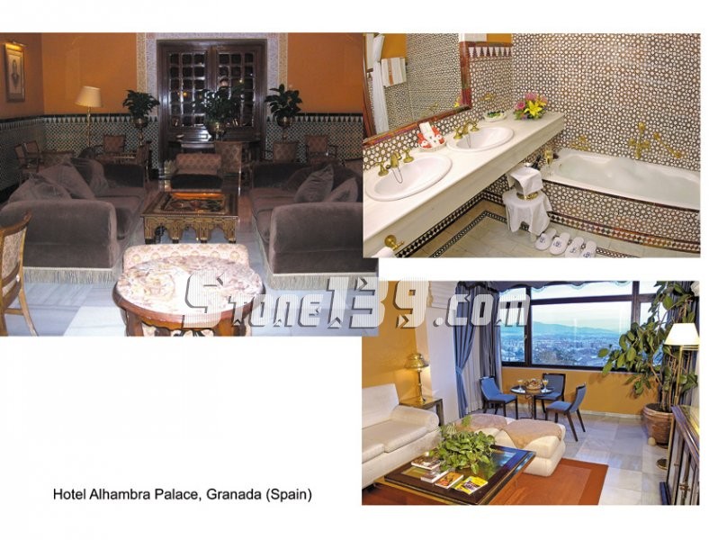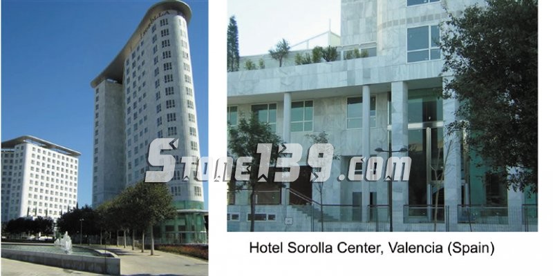 大理石的洗手間,鍍金的水龍頭,各種臺階,圓柱,地面使用的都是這種天然大理石,以此來領先酒店裝修的新潮設計,那些在裝 飾方面尋找與眾不同,時髦和新穎的酒店,都很喜歡這種天然石材。另外,還可用于外墻的裝飾,這樣使酒店看起來與眾不同,最有代表性的酒店是Valecia (瓦倫西亞)市的Hotel Sorolla Center (索若亞中心酒店)。