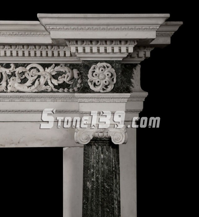 Chesney's壁爐,Thassos大理石雕刻,18世紀壁爐,由美國白宮收藏,該作品深受伯特亞當風格的影響,用帶有笛形裝飾的愛奧尼亞式壁柱支撐蓋板,而蓋板上的圖案是精美的壺飾和瓶飾。