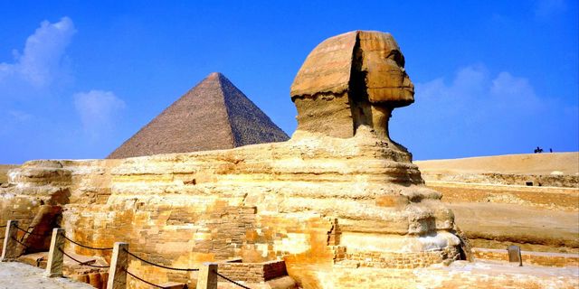 四、獅身人面像它高達20米,長達73米,是一座平臥的獅子,卻有一個人頭。它的臉部最寬處是4.2米,是用建造大金字塔采石場上留下的一大塊圓石刻出來的。