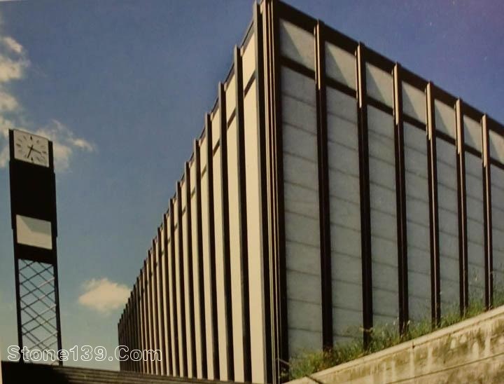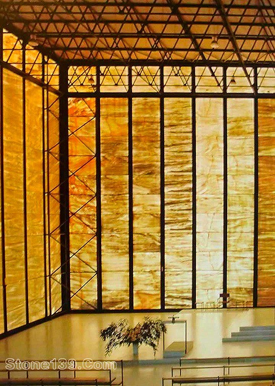 2、在瑞士St pius(1996)教堂設(shè)計中,建筑師Franz Fueg就嘗試著用透明石材創(chuàng)造教堂內(nèi)部神秘的空間效果,教堂外墻由灰色的尺寸1. 5 m和1 m,厚度是28 mm的大理石板構(gòu)成,板材自身由鋼柱支撐,光線可以穿過大理石落到室內(nèi),形成朦朧而又有石材紋理的特殊光影效果,同時反映著四季和周邊景色的不斷變化。