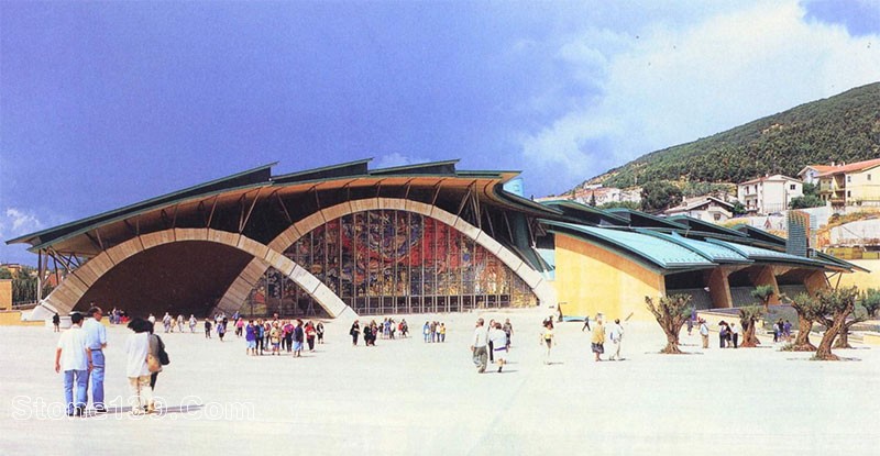 3、建筑師倫佐 皮亞諾和工程師彼得?懷斯合作設(shè)計的意大利教士朝圣教堂(Padre Pio Pilgrim-age),利用了當(dāng)?shù)氐氖牟⒉捎昧撕髲埑兄剡@一石材運用的新技術(shù),形成了45m跨度的石拱結(jié)構(gòu),創(chuàng)造了石材跨度的歷史之最.而整個建造過程也是石材開采、工廠加工、施工過程一系列的高新技術(shù)的運用成果,將石材的性能發(fā)揮到了極致。