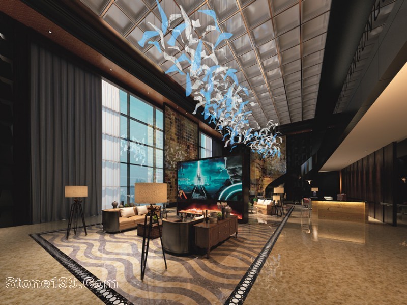 地面上,用紫羅紅搭配雅白珊瑚玉,華麗中不失摩登、風情。而雅白珊瑚玉在墻面的整片展示,則給空間提升了活力,讓整個走廊籠罩在溫暖而尊貴的格調中。