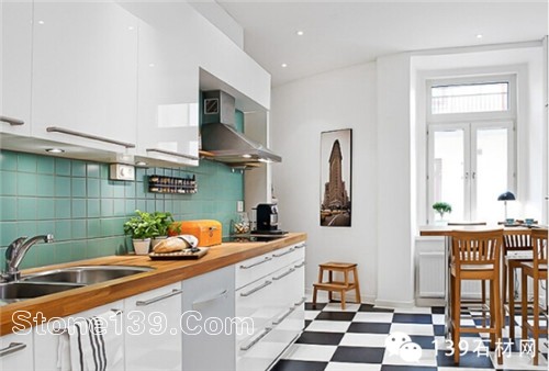 廚房裝修得很是清新,比較干凈,大馬賽克的地板磚,看起來(lái)視覺(jué)感蠻不錯(cuò),而且整個(gè)廚房布局非常合理。