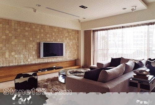 以鑿面萊姆石拼拼貼而成的主墻面,由于采用深淺不一的暖色萊姆石,創(chuàng)造出有如編織藝術品的效果,也像是一幅馬賽克畫作,石材墻面以鋼材做收尾,再加上下方的L形柚木柜體,如此細致又獨特的主墻,為空間注入渾然天成的休閑感。