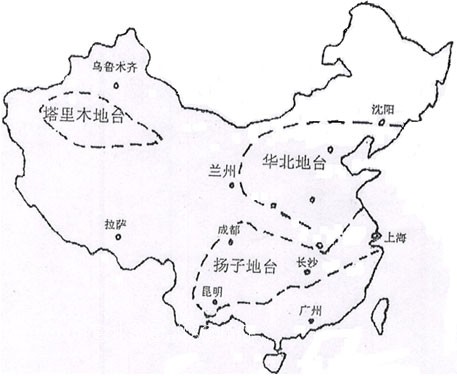太古宙時期形成的地層稱為太古宇,包括古太古界遷西系,新太古界阜平系、五臺系,經歷了遍及全球范圍的遷西(地殼)運動,阜平運動、五臺運動。原始地殼的表殼巖(以變質的火山巖、沉積巖為主)在局部地區隆起,形成地臺的核心,或稱為陸核、雛地臺。以此為核心向四周漫延形成地臺。在中國區內,分別形成三個地臺既華北地臺、塔里木地臺、揚子地臺、因其面積相對小,四周又都是地槽區及洋殼區,環境動蕩,所以有人稱其為準地臺,確實如此,見圖1.
