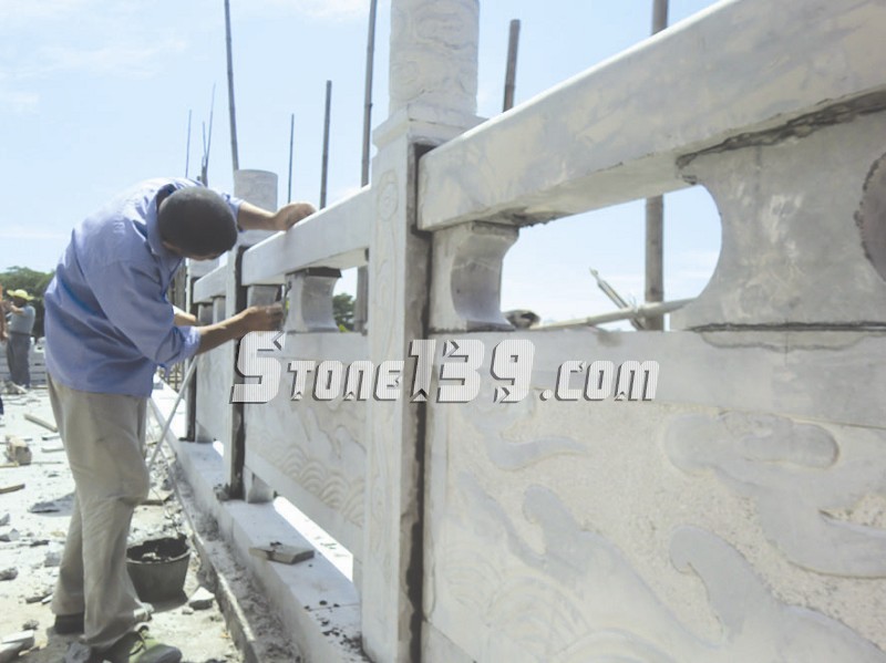 將石攔板上墊塊按設計位置安裝在攔板上,當墊塊與攔板、扶手間縫隙較大時,應采用云石膠灌縫。 將石欄桿上扶手輕抬對準立柱榫槽就位。